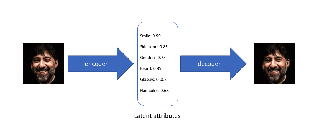 假设任何人像图片都可以由表情、肤色、性别、发型等几个特征的取值来唯一确定,那么我们将一张人像图片输入自动编码器后将会得到这张图片在表情、肤色等特征上的取值的向量X’,而后解码器将会根据这些特征的取值重构出原始输入的这张人像图片。