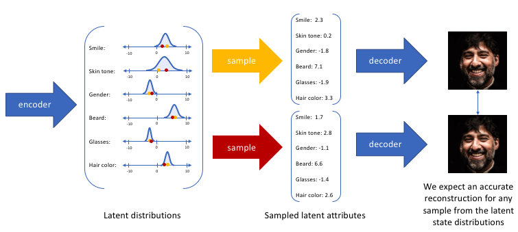 在上面的示例中,我们使用单个值来描述输入图像在潜在特征上的表现。但在实际情况中,我们可能更多时候倾向于将每个潜在特征表示为可能值的范围。例如,如果输入蒙娜丽莎的照片,将微笑特征设定为特定的单值(相当于断定蒙娜丽莎笑了或者没笑)显然不如将微笑特征设定为某个取值范围(例如将微笑特征设定为x到y范围内的某个数,这个范围内既有数值可以表示蒙娜丽莎笑了又有数值可以表示蒙娜丽莎没笑)更合适。而变分自编码器便是用“取值的概率分布”代替原先的单值来描述对特征的观察的模型,如下图的右边部分所示,经过变分自编码器的编码,每张图片的微笑特征不再是自编码器中的单值而是一个概率分布。